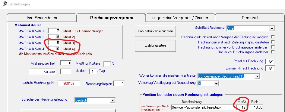 Wir empfehlen, bei Buchungen, die in den Juli hineinlaufen, zwei Buchungen nacheinander zu erstellen und die entsprechenden Steuersätze vorzugeben. (verfahren Sie bitte auch mit zwei Buchungen bei Überschneidung zum 01.01.2021) Die Steuersätze in den 4 Eingabefeldern MwSt. 1 bis MwSt. 4 dürfen nicht identisch sein. Bei Verwendung von Kurtaxe oder Bettensteuer muss in dem enstprechenden Feld MwSt. für Kurtaxe und MwSt. für Bettensteuer eine Null eingegeben werden, wenn dafür keine MwSt. berechnet wird. Die Ausgabe aller 4 Steuersätze (bei der Steuererklärung 2020) jetzt in der Rechnungsübersicht als Ausgabe inder CSV-Datei und in der Druckvariante möglich. Bei den Parkgebühren können Sie jetzt in den Einstellungen die MwSt. anpassen. Die Rechnungen können in dieser Zeit nicht mehr auf Plausibilität geprüft werden. Schalten Sie bitte die Prüfung ab.
